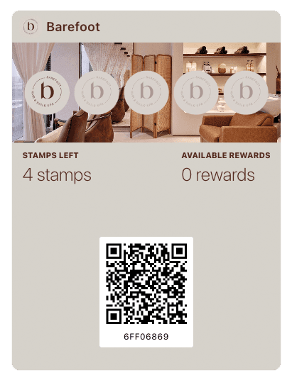 At each visit, scan the client's card from the scanner app. The stamp is added automatically and the client sees progress in her Wallet instantly. At the 4th session, she knows the 5th is free, and that motivates her to book.